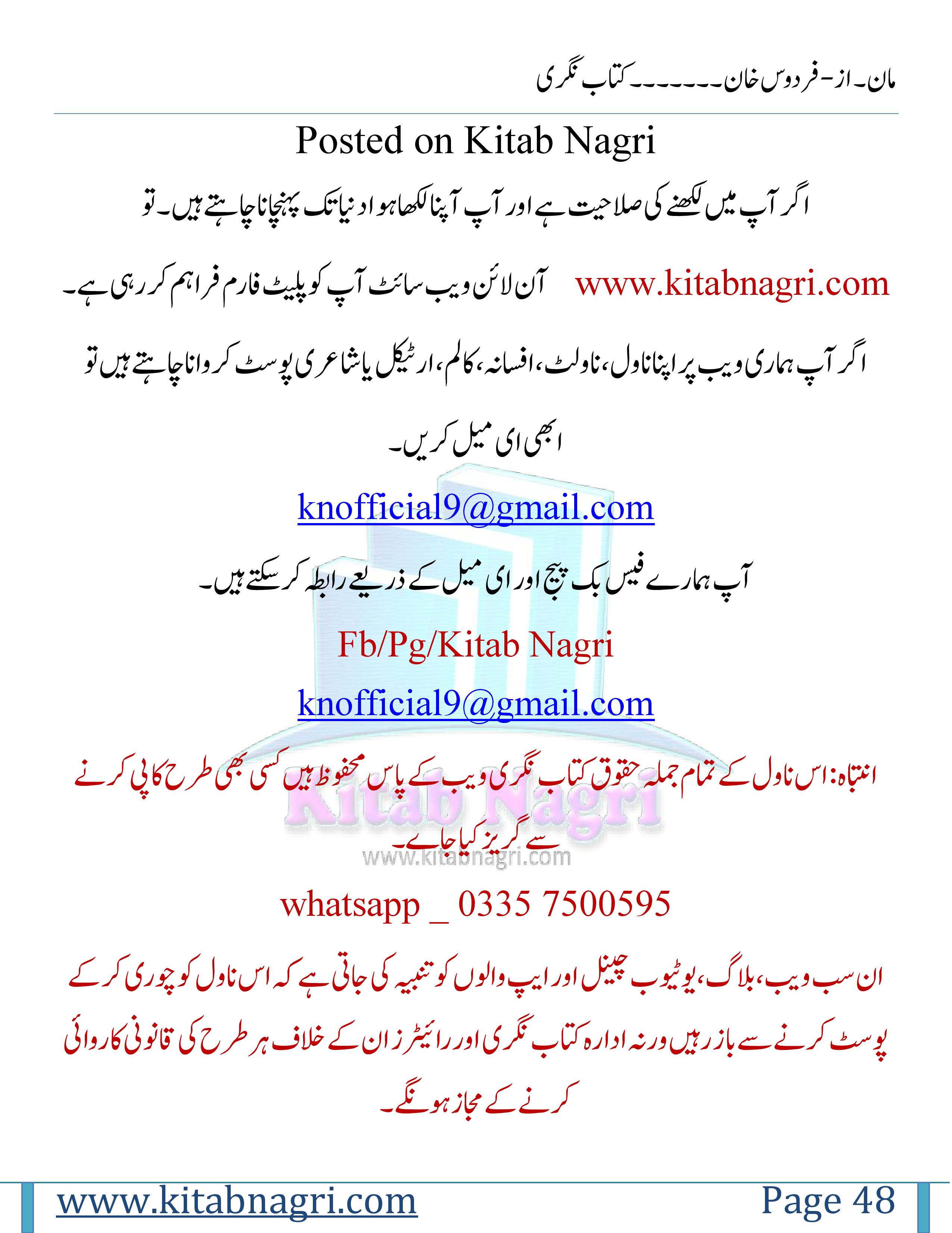 ان سب ویب،بلاگ،یوٹیوب چینل اور ایپ والوں کو تنبیہ کی جاتی ہےکہ اس ناول کو چوری کر کے پوسٹ کرنے سے باز رہیں ورنہ ادارہ کتاب نگری اور رائیٹرز ان کے خلاف ہر طرح کی قانونی کاروائی کرنے کے مجاز ہونگے۔