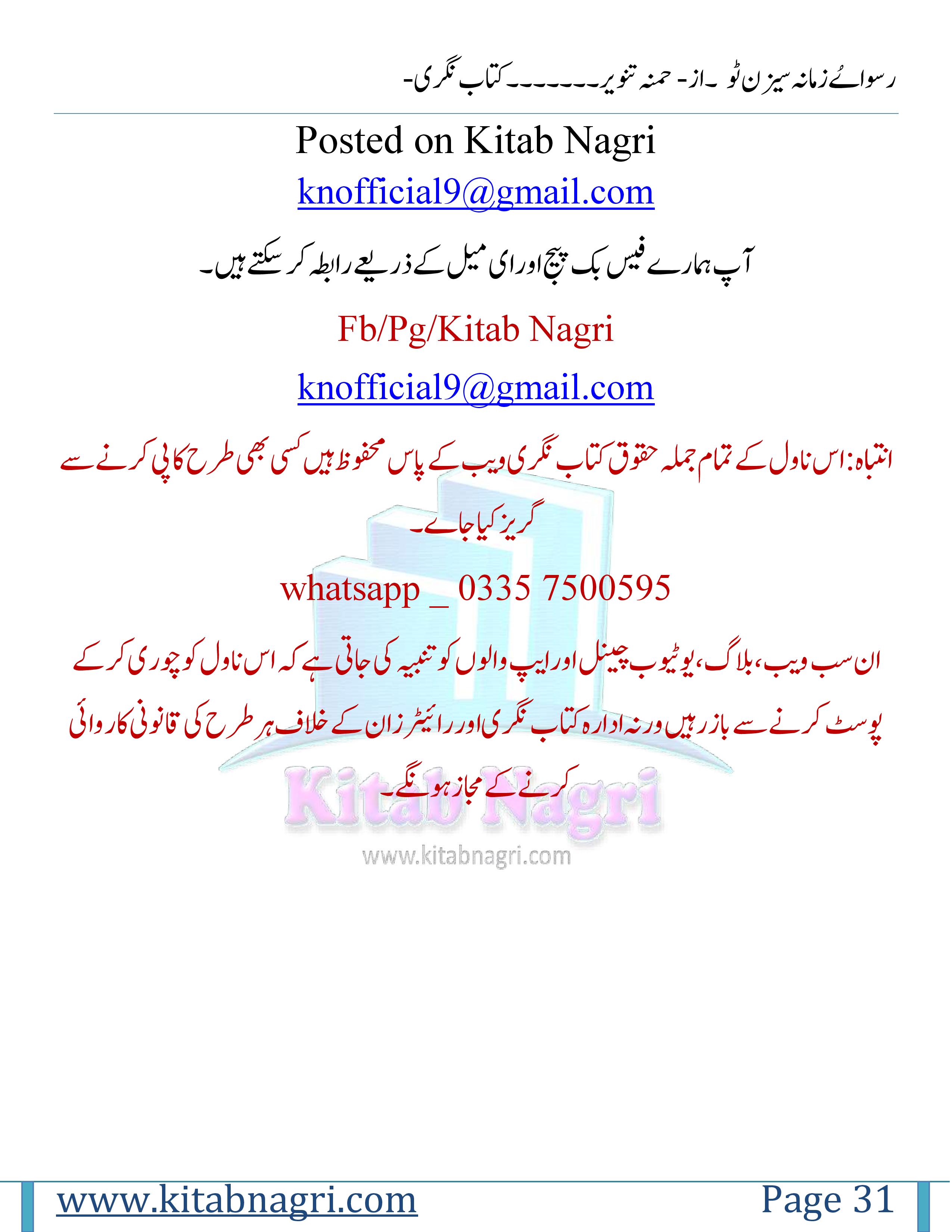 ان سب ویب،بلاگ،یوٹیوب چینل اور ایپ والوں کو تنبیہ کی جاتی ہےکہ اس ناول کو چوری کر کے پوسٹ کرنے سے باز رہیں ورنہ ادارہ کتاب نگری اور رائیٹرز ان کے خلاف ہر طرح کی قانونی کاروائی کرنے کے مجاز ہونگے۔