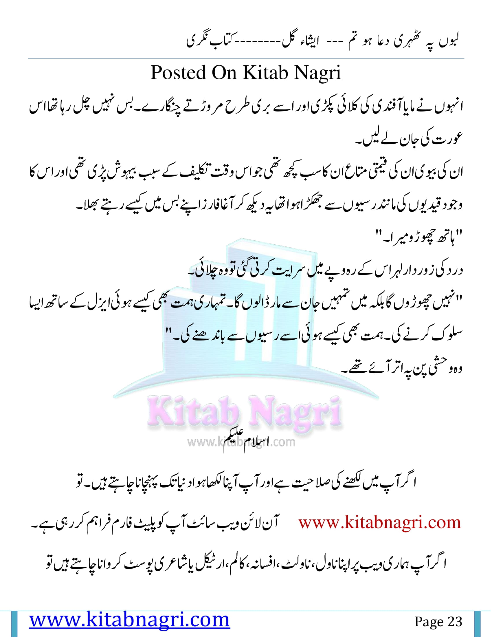 ان سب ویب،بلاگ،یوٹیوب چینل اور ایپ والوں کو تنبیہ کی جاتی ہےکہ اس ناول کو چوری کر کے پوسٹ کرنے سے باز رہیں ورنہ ادارہ کتاب نگری اور رائیٹرز ان کے خلاف ہر طرح کی قانونی کاروائی کرنے کے مجاز ہونگے۔